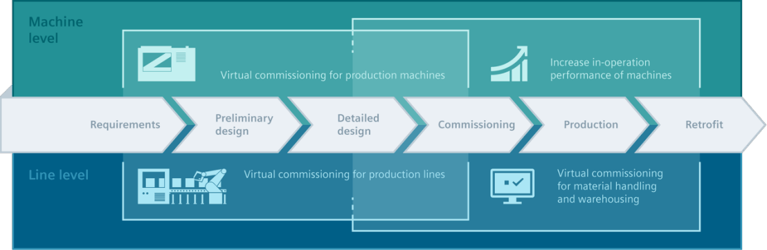 Virtual commissioning can be understood in a much broader sense than the name suggests. A well-integrated virtual commissioning model has potential applications in many other phases of the automation system life-cycle, such as operator training, improved after-sales and ongoing optimization, sales and marketing, and as a collaboration platform. See all the applications here.